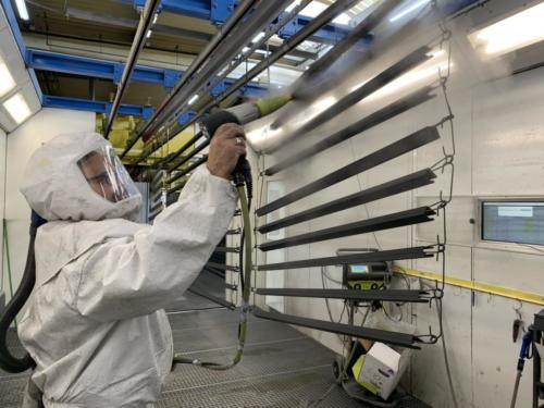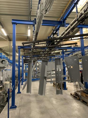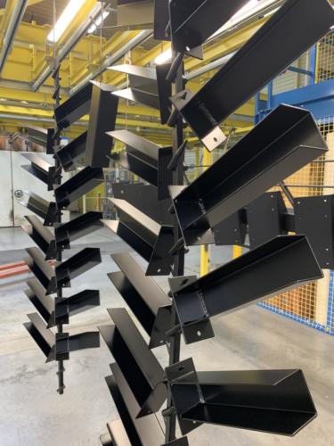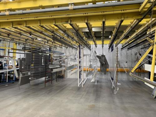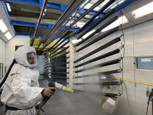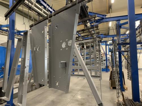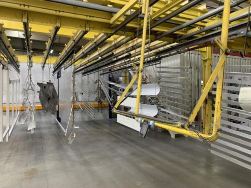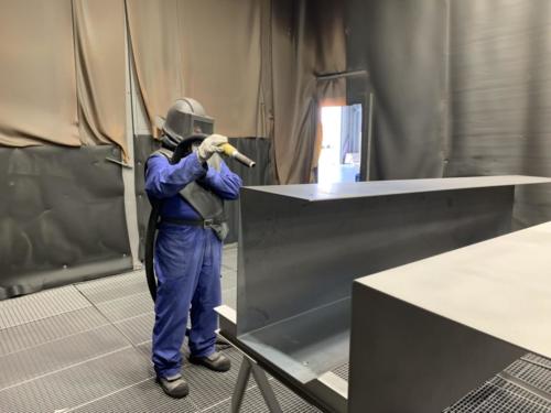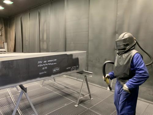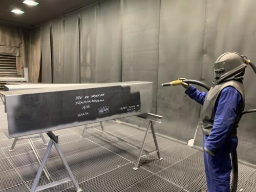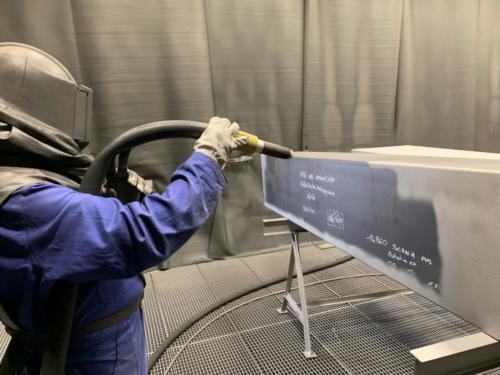 Elle est projetée à 7 bars pour créer une rugosité nécessaire à l’application de la peinture. La cabine est équipée d’un racleur automatique pour la récupération de la grenaille.